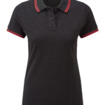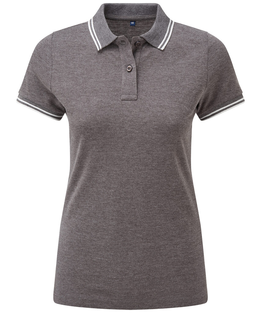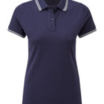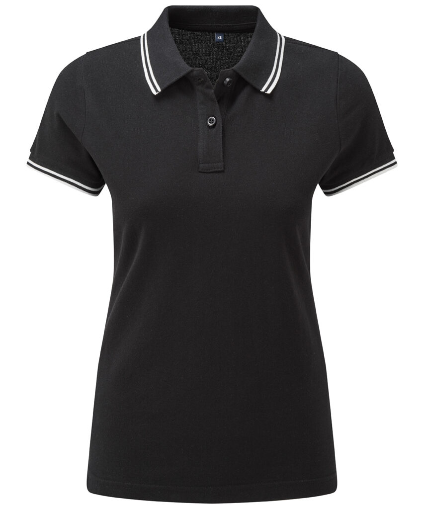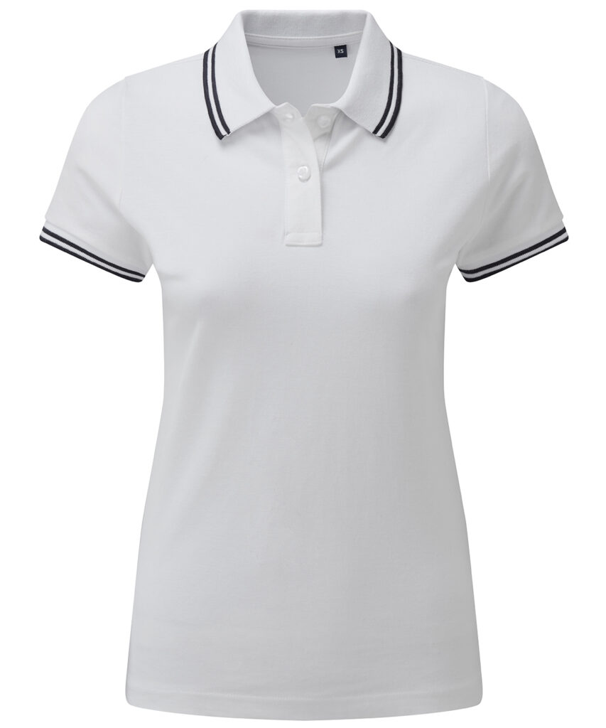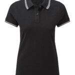 Fitted polo for women with tipped contrast detail to the collar and cuffs. Two contrast coloured buttons on placket. Contrast colour on side vents. Twin-needle stitching on hem. Ribbed knit collar and sleeve cuffs. Machine washable. Product contains no branded neck label. Removable Kimble or looped garment tags. Inner seam label holds important product information on one label with a second label containing brand information which can be cut-away. Please note old stock may contain a fixed branded label.
