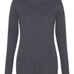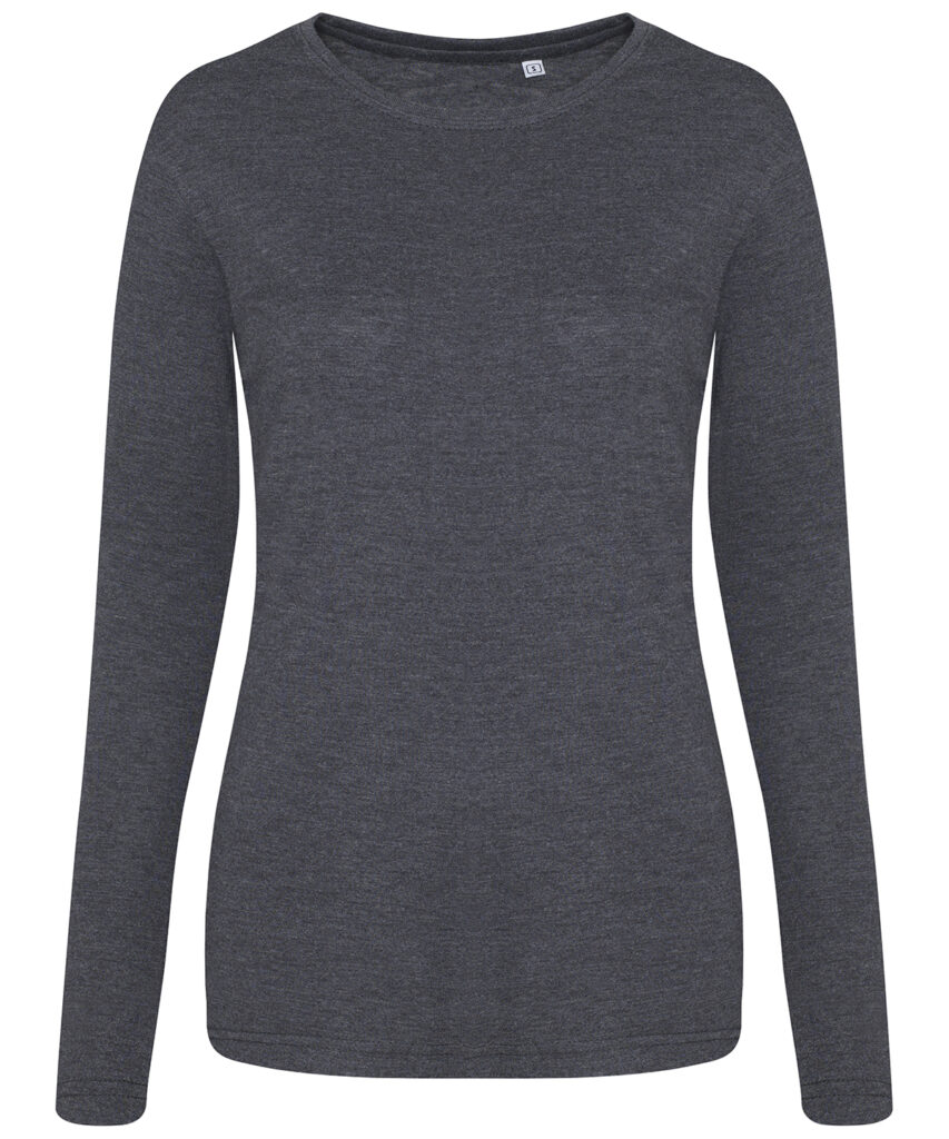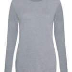Girlie fit long sleeved T. Size tab label. Triblend fabric for style and comfort. Taped neck. Twin-needle stitching on sleeves and bottom hem. Ribbed crew neck style. soft-feel fabric. Side seams. Set-in sleeves.