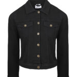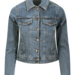 Cotton/elastane blended denim jacket with classic denim styling. 4 pocket design, shank button placket, button cuffs and adjustable back. Specific feminine fit with crop design. Contemporary female fit. Fashion fit. Stretch denim. 4 pocket styling. Classic light and dark blue washes. Contrast stitching. Classic denim jacket panelling. Button cuff detail. Inside back neck hanger loop.