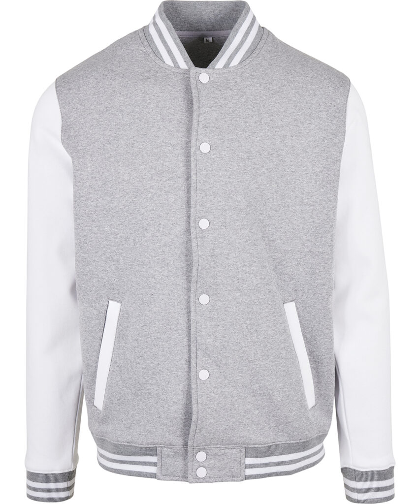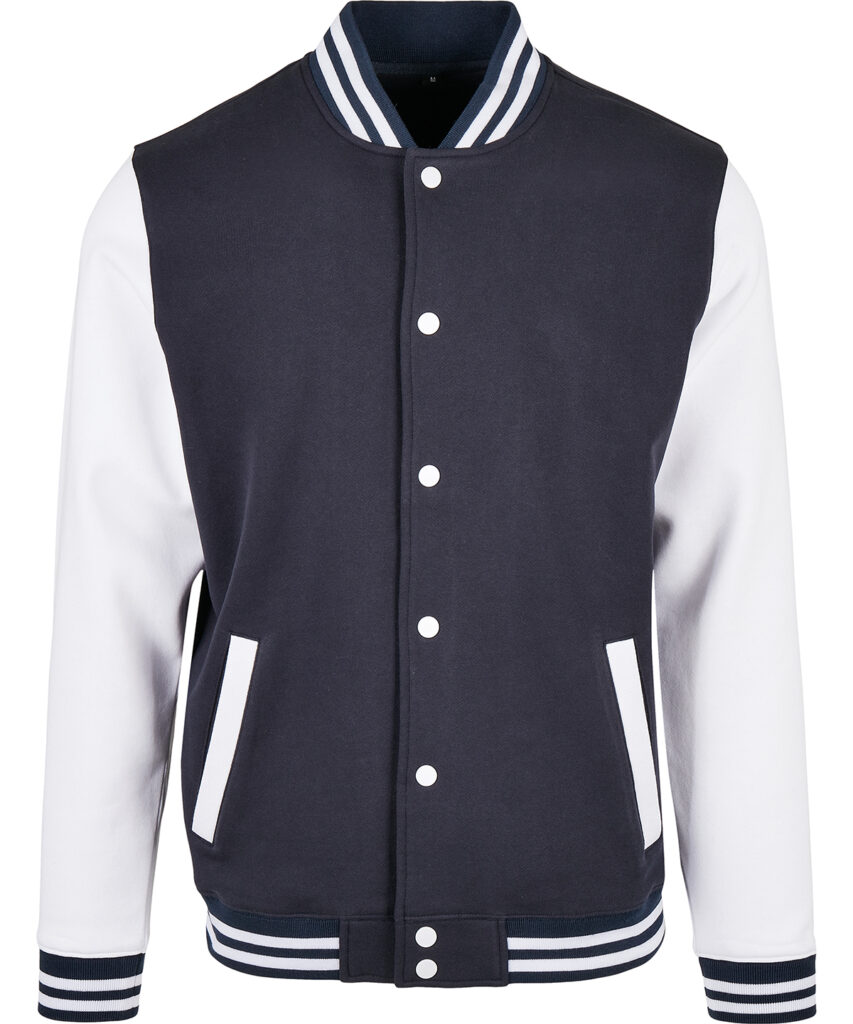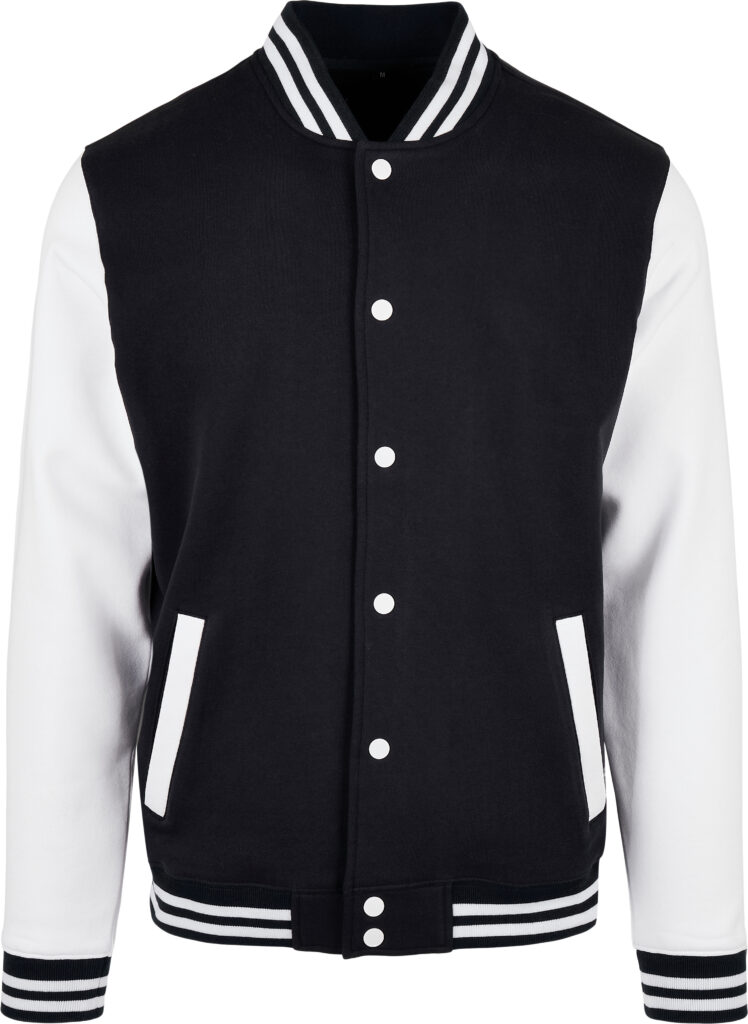 Sporty jacket for men in college style. Full-length button panel, wide ribbed hem and sleeve cuffs and side welt pockets. The cotton mix of the jacket is perfect for refinement and can easily be customised. This item is manufactured in a FAMA Certified factory. FAMA stands for Facility and Merchandise Authorisation and is a high standard production certificate. .