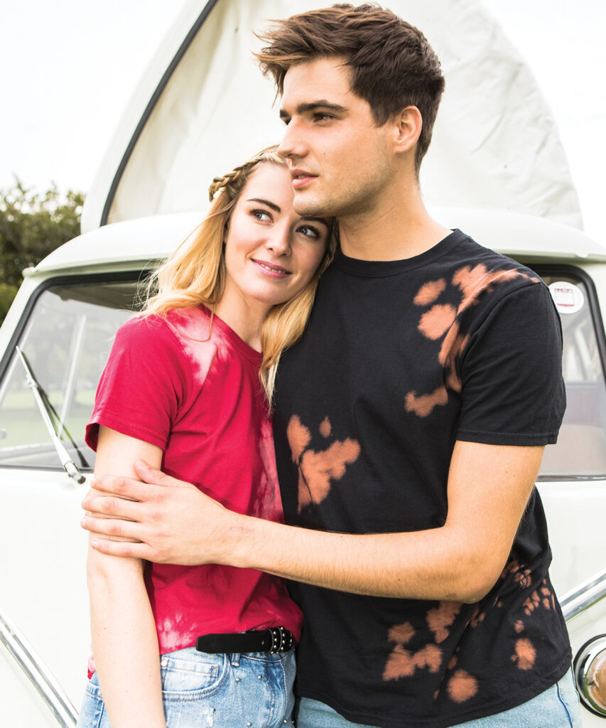 Make a statement with this retro inspired bleach out T. Using 4.5 oz. ringspun cotton for soft handle and 3 bold colours this make a unique embellishment base.