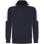Unisex adults polyester hoodie with brushed back fleece inner for comfort. Contrast sleeves and side panelling on contrast only. Ribbed cuffs and hem. Crossover hood neck at centre front. Zipped welt pocket in front panel side seam. Three-piece hood. Offered in contrast and solid colours. Tear-out label. Amfori BSCI certified.