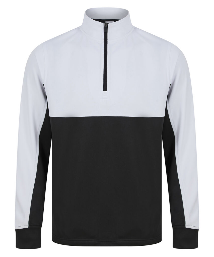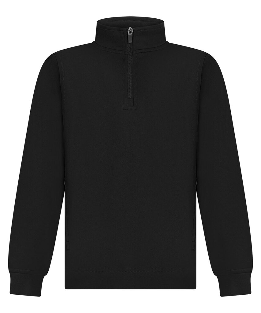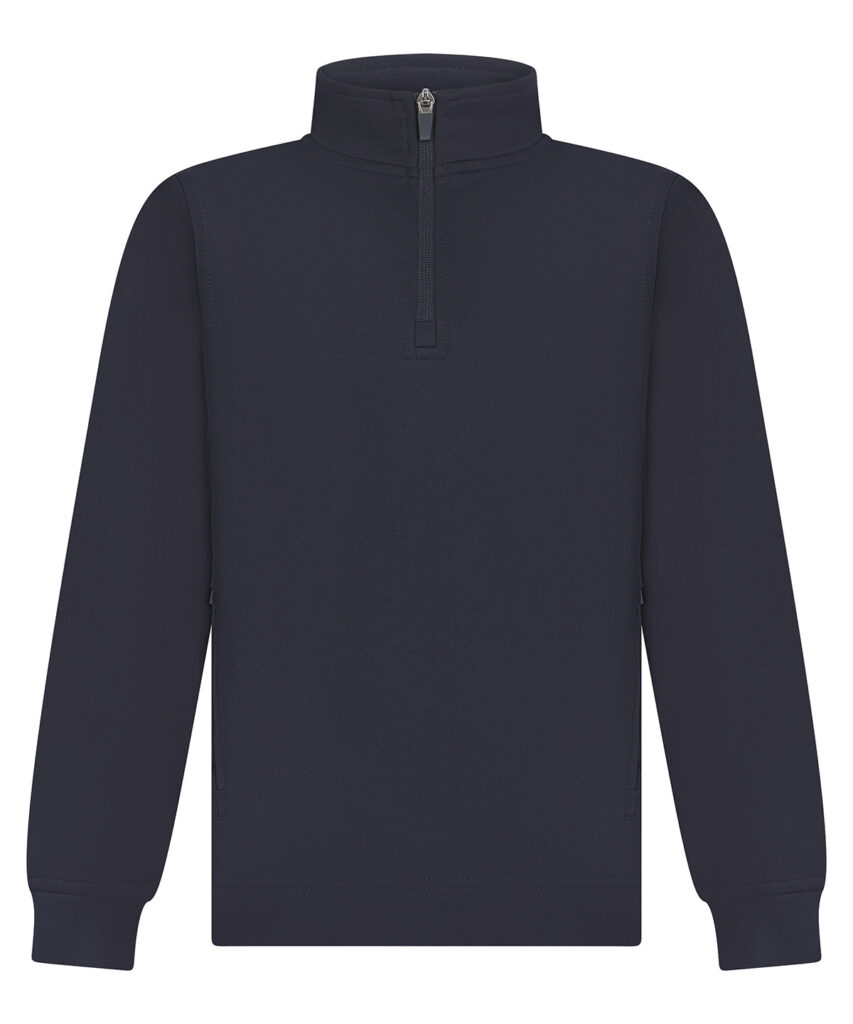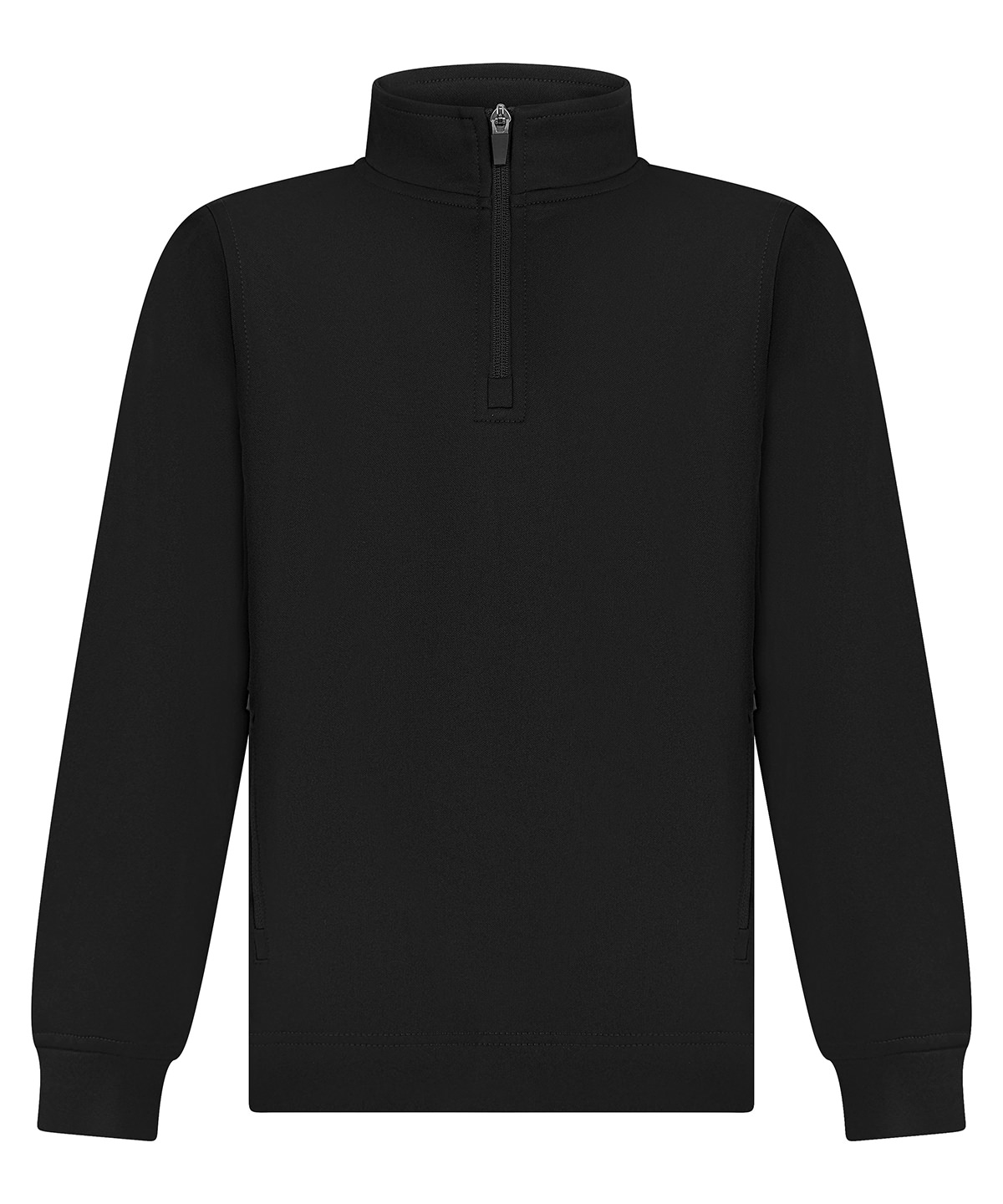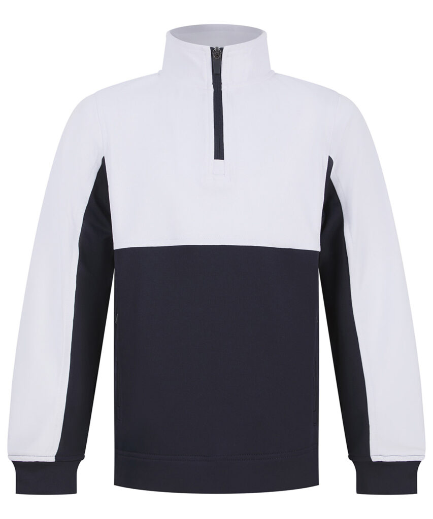 Contrast upper chest and underarm panels. Quarter zip. Side panels. Reverse nylon zips centre front and side pockets. 1×1 ribbed cuff sleeve. Semi-automatic zip pull and slider. . BSCI certified.