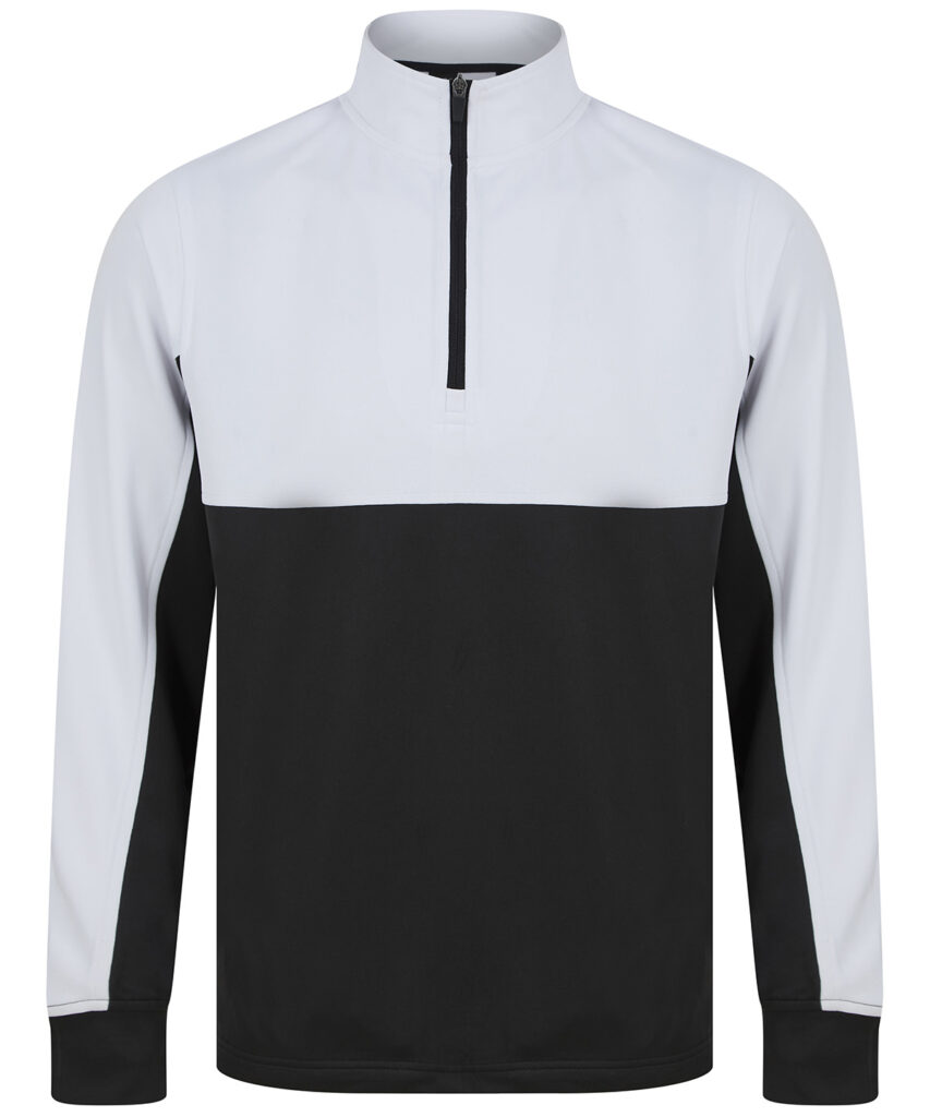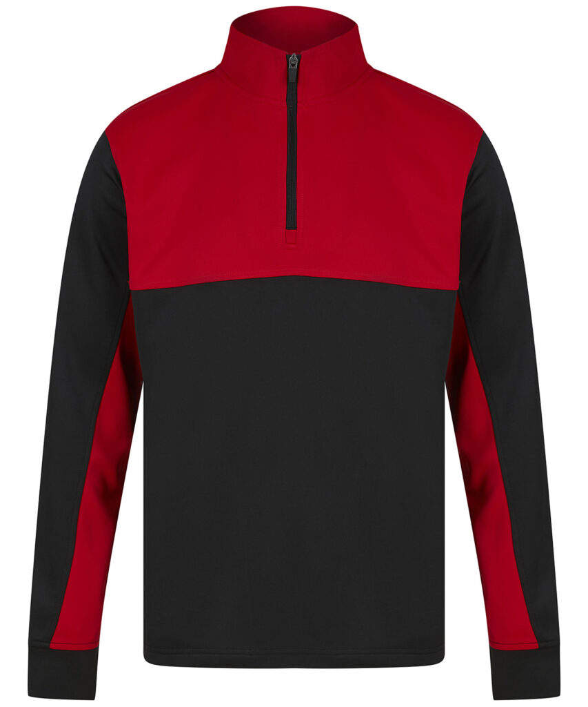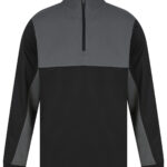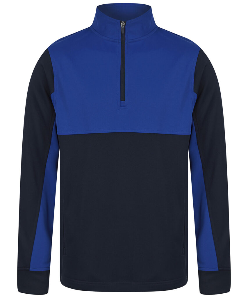 Contrast upper chest and underarm panels. Quarter zip. Side panels. Reverse nylon zips centre front and side pockets. 1×1 ribbed cuff sleeve. Semi-automatic zip pull and slider. . BSCI certified.