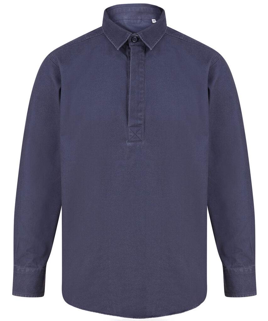 Long-sleeved plain drill shirt. Pullover with concealed button fastenings. Heavy garment wash. Adjustable button cuff and placket. Shaped hem. Back neck hanging loop. Back neck buggy. Self-fabric vent inserts. Tag-free for easy rebranding. SEDEX certified. BSCI certified.