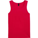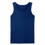 Wide straps. Rib knit trim applied to neckline and armholes. Twin needle bottom hem. Quarter-turned to eliminate centre crease. Tearaway label.
