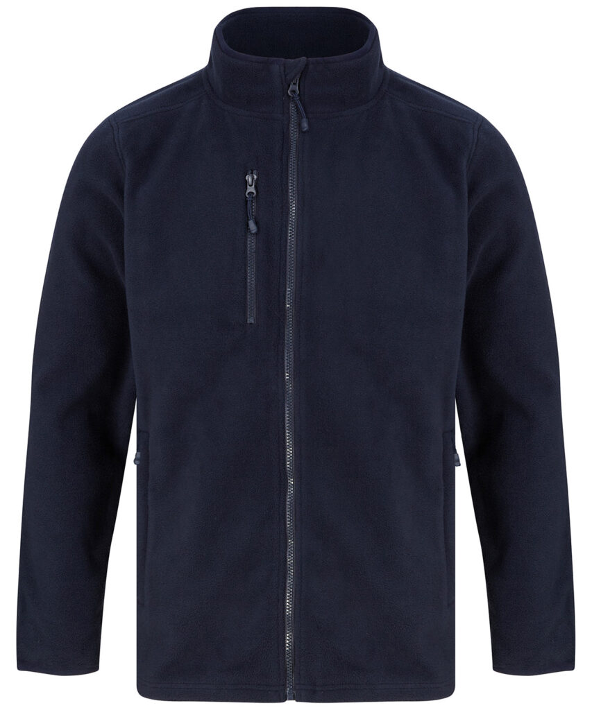 Sustainable fabric using recycled materials. Made from recycled polyester. Anti-pill microfleece. Recycled zips. Set-in sleeves. Shoulder panel. 2 single welt zipped pockets. Zipped chest pocket. Back neck tape. Back neck outer hanging loop. Full-length front zip with zip guard and facing. Non-slip zip pulls. Stretch binding on collar and cuffs. Henbury cut-out label for easy rebranding. Biodegradable plastic bag packaging. BSCI certified. Oeko-Tex certified. SEDEX certified.