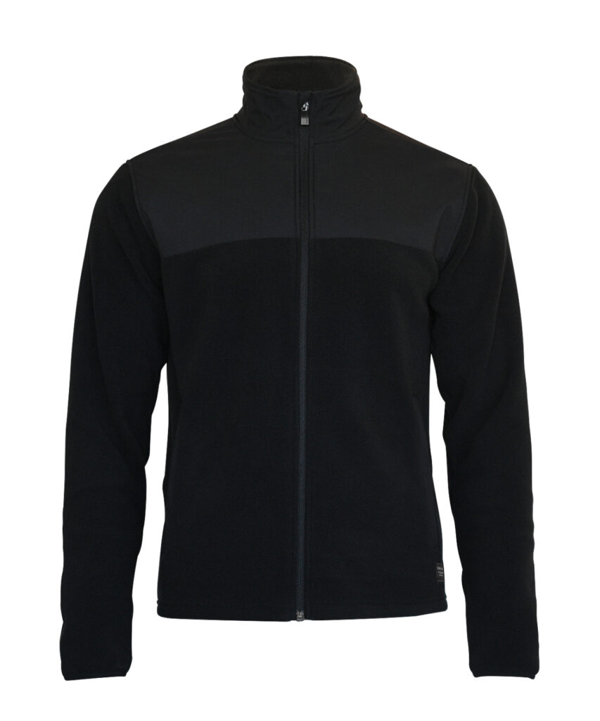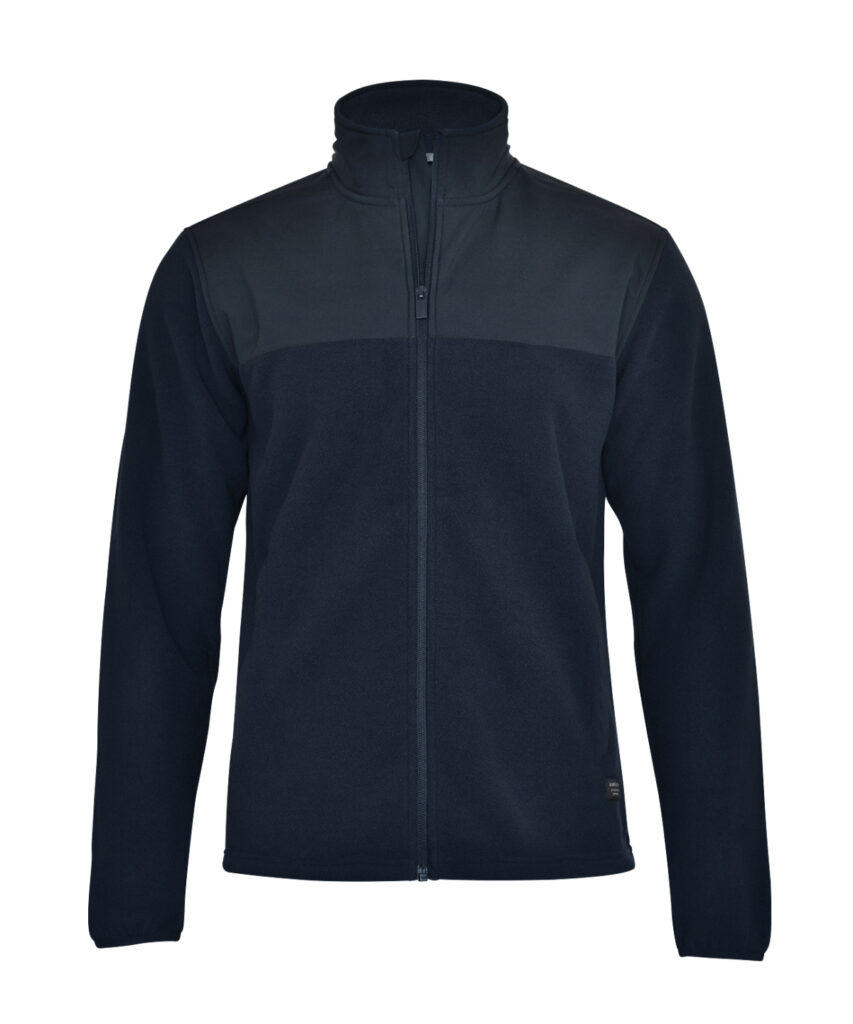 Fleece: 100% Recycled polyester. Contrast fabric: 100% Polyester (yoke, pockets and outside collar)
