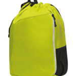 Easy access front storage pocket. Carryall with drawstring cinch top. Lumbar valuables pocket. Mesh ventilation panels. Durable cord straps. Reach certified.