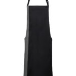 Classic Premier bib apron with contrast coloured panel. Self fabric neck. Self fabric ties 90cm long, width 72cm, length 86cm. 60C domestic wash. Sliding adjusting buckle. Two front side pockets with slanted opening. BSCI certified. Reach certified.