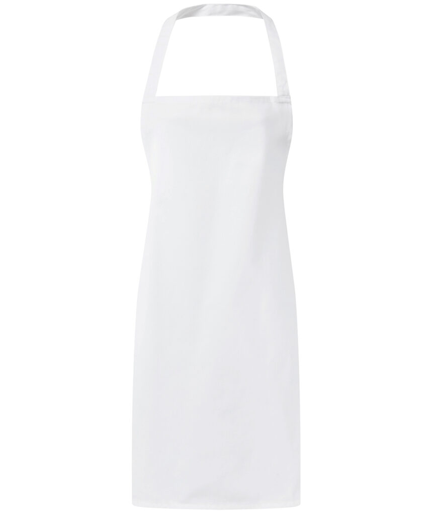 Essential Premier bib apron. Self fabric neck tie and self fabric ties 78cm long. WRAP certified. Oeko-Tex certified. BSCI certified. Reach certified. SEDEX certified.
