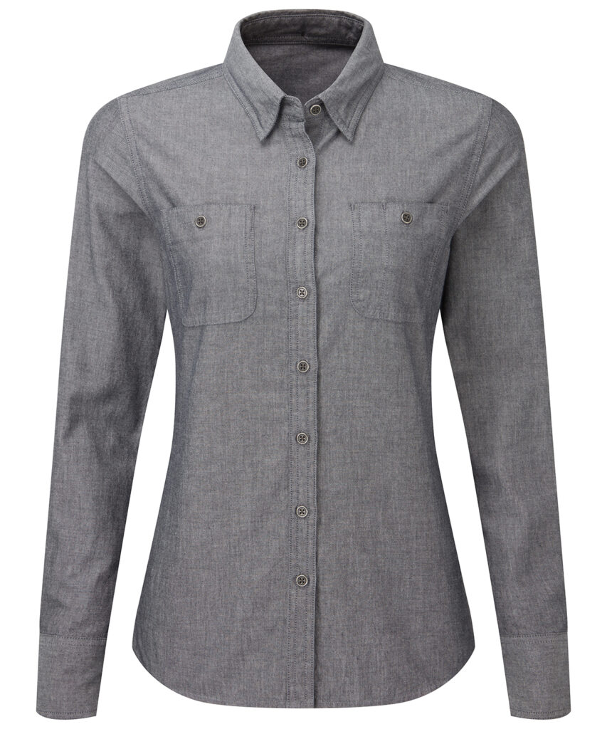 A chambray finish complements this Fairtrade organic cotton womens shirt. Twin-needle stitching features across the style from the cuffs and sleeves, through to the collar, placket and chest pockets.? Two button-down chest pockets add to the overall aesthetic of the shirt, together with a button down collar to the underside. ?A single button features on the back of the collar to secure an apron neatly in place.