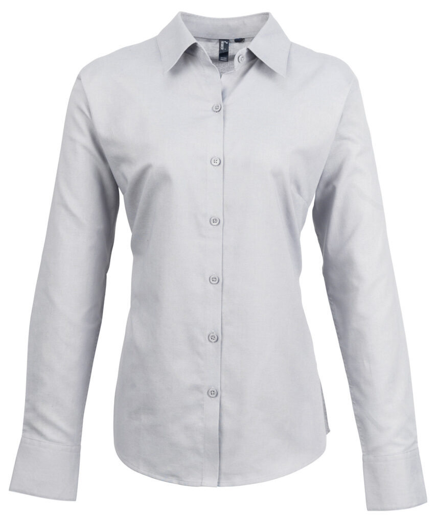 Ladies signature Oxford long sleeve blouse with wrinkle free finish for a smart and professional appearance. Soft collar styling. Rounded bottom hem. Fitted styling with bust and back darts. Pearlised buttons on light blue and white shirt, self colour buttons on remaining. Double buttons on cuff. Made from OEKO-TEX Standard 100 fabric. WRAP certified. BSCI certified. Reach certified. SEDEX certified.