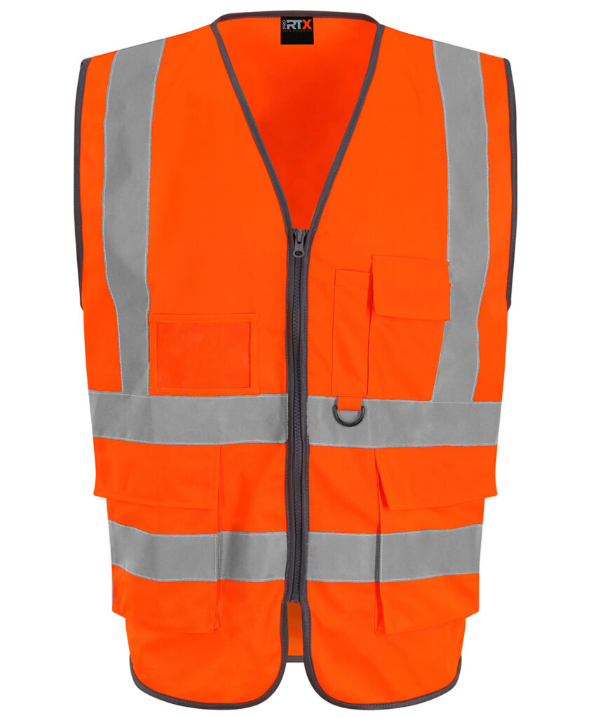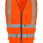 Certified EN ISO 20471:2013+A1:2016. RIS-3279-TOM ISSUE 1:2016 (Orange only). HV Orange & HV Yellow – Class 2. Two-Colour – Class 1. Full length front zip fastening. ID Card pocket. Mobile phone pocket. Key loop. Two side front expandable pockets with flaps. Over shoulder and around body reflective tapes.