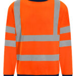 Certified EN ISO 20471:2013+A1:2016. RIS-3279-TOM ISSUE 1:2016 (Orange only). HV Orange/Navy & HV Yellow/Navy – Class 3. Ribbed contrast colour collar. Ribbed contrast colour cuff and hem. Inner fabric brushed fleece. Over shoulder, around arm and around body reflective tape.