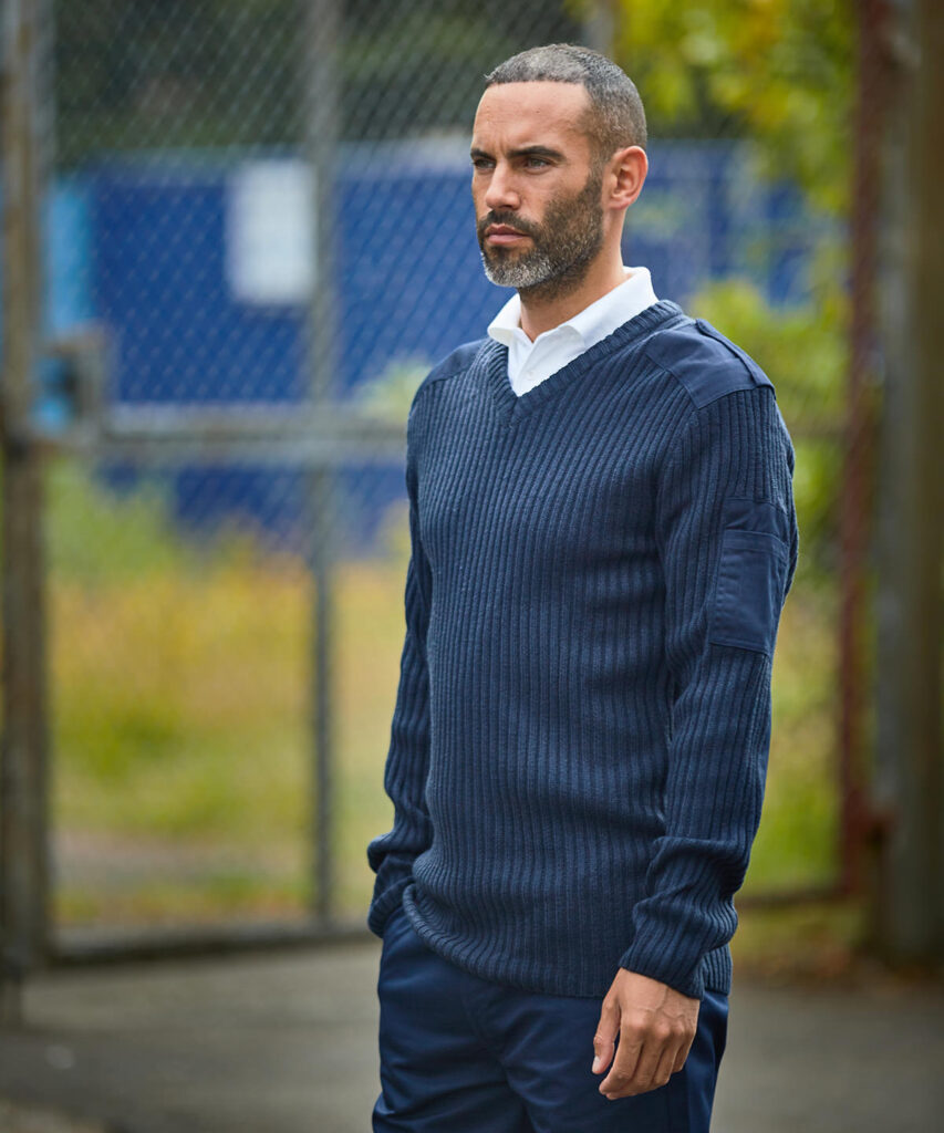 Ideal for security applications, the Pro security sweater is 100% acrylic for extra durability with polycotton tear and release epaulettes on the shoulder, elbow patches and a pen pocket. This style ensures a professional look while remaining comfortable, practical and warm.