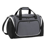 Detachable adjustable shoulder strap with pad. Shoe tunnel/wet pocket. Internal valuables pocket. Elasticated bottle loops. Zippered end pockets. Internal mesh pockets. Padded hand grip. Reach certified.