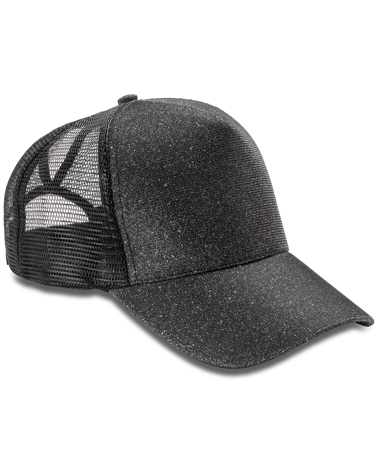 5-panel cap (4 mesh/1 fabric). Sparkle fabric stiffened front panel and peak. Mesh back with ponytail hole. Tear-release adjuster. Semi-curved fabric peak made from plastic. Tear-away label.