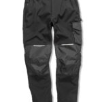 Multi-use cargo thigh pocket with zip. Tough, articulated knee panels. Rubber tear release pocket strip. Critical stress point bar tacking. YKK zip with button fastening. Toughened ankle scuff panel. Triple needle stitched seams. Hand warmer side pockets. Expandable waistband. Reflective detailing. Rear pockets. Hammer loop. Rule pocket. Belt loops. Durable water-repellent finish 3-layer bonded mechanical softshell comprising: outer layer – 100% Polyester; mid-layer – waterproof 8000mm, breathable 3000mvp and windproof TPU membrane; inner-layer – 100% Polyester. Knee panels: PU coated Oxford polyester. Oeko-Tex certified.