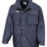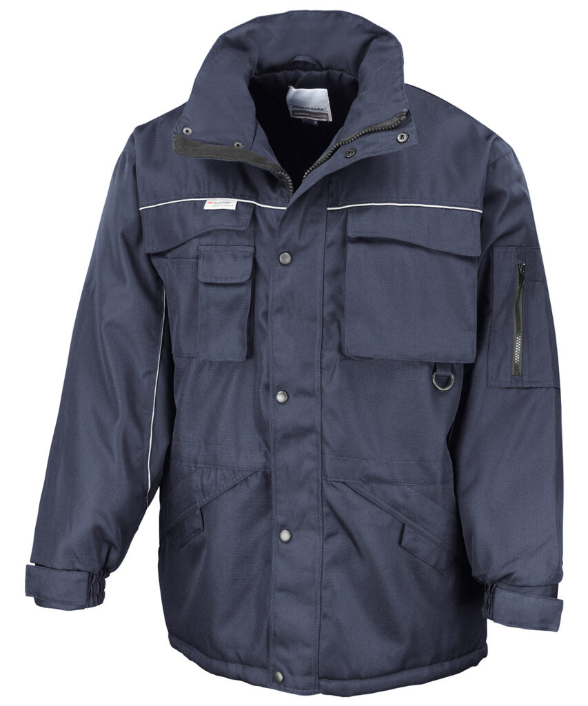 Water repellent. Windproof. Heavy duty reinforced seams wtih bar tacked pockets and stress points. Full front zip fastening. 2 deep front patch pockets, 2 front chest pockets including 2 pen holders, 1 sleeve pocket including 3 pen holders, 1 outside phone pocket, 2 inside pockets and 1 large mesh pocket. 2 D-rings (1 concealed). Cable loops for headphones. Active fleece by Result lined drip channel. Adjustable shockcord waist. Elasticated cuffs with tear release adjusters. Stud closing storm flap. Reflective piping detail to front, back and sleeves. Piping detail to front, back and sleeves incorporating 3M Scotchlite reflective materials.Decoration Guidelines:Decorating methods: Embroidery, Transfer print & Screen print transfer. Decorators access point: Concealed Inner back zip & left chest pocket. Oeko-Tex certified.