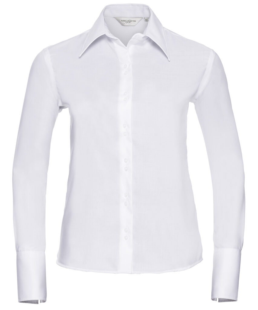 Made using the newest technologies of non-iron fabric that stays wrinkle free and keeps the wearer looking and feeling smart all day long. Contemporary fit combined with contemporary designed features. Stylish and relaxed long edged collar. Fashionable twin button fastening. Shaping at the waist for flattering feminine silhouette. Long, squared edge flared cuff with single button fastening and option for cuff links. Rounded hem. WRAP certified.
