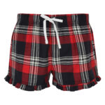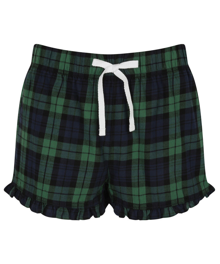 Woven tartan shorts with frill hem. Full elasticated waist with contrast mock drawcord. Tear-out label. BSCI certified. Vegan certified.