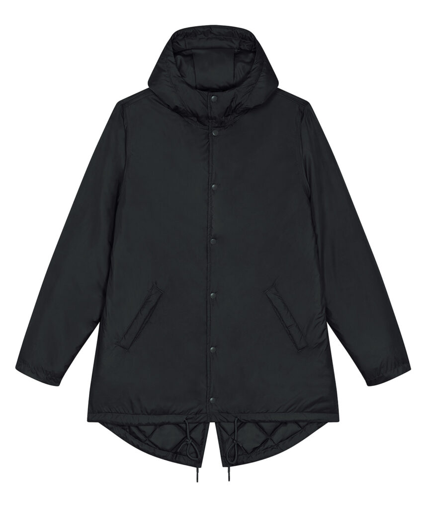 Unisex padded parka jacket. Set-in sleeve. Metal snaps at centre front. Welt pockets at front. Round drawcords at bottom hem. Semi-elastic sleeve cuff. Double layered hood with adjustable plastic stopper and elastic cord on inside. Diamond quilting on inside lining. Inside zip opening at bottom hem and wearers left chest for easy decoration.