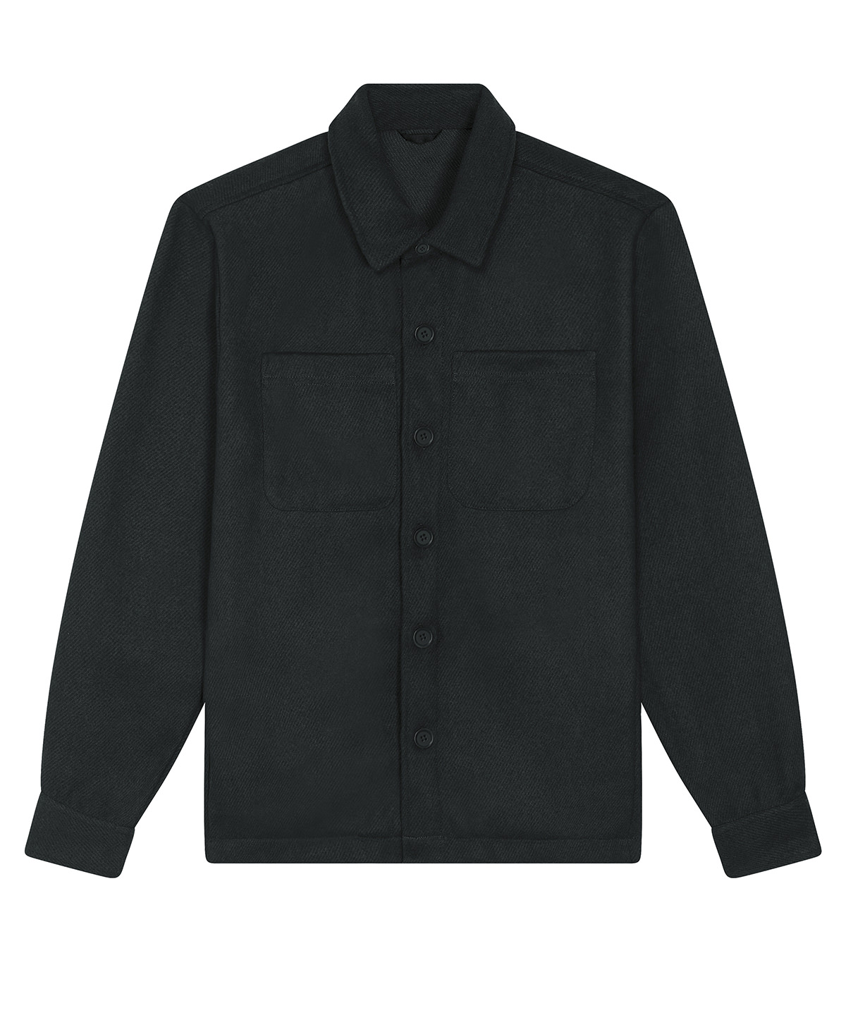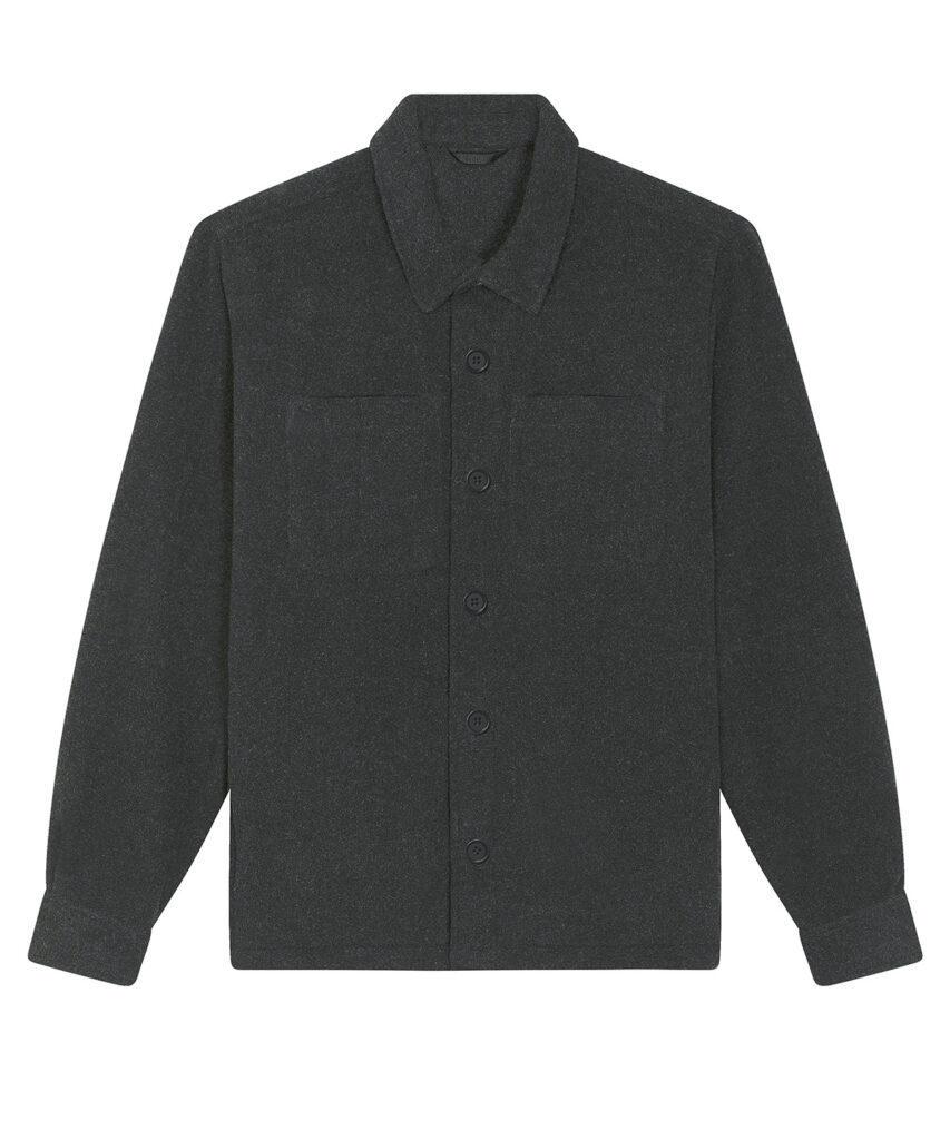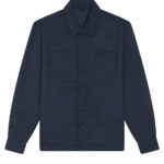 Unisex, unlined shirt jacket. Set-in sleeve. Self-fabric collar with collar stand. Button-down front placket with one button on sleeve cuff. Chest pockets and side seam pockets on both sides. Inside hanger loop in grosgrain tape. Spare buttons attached on inside seam.