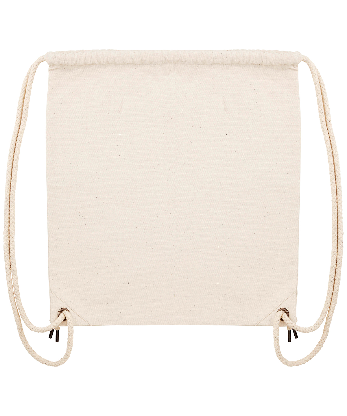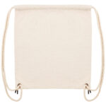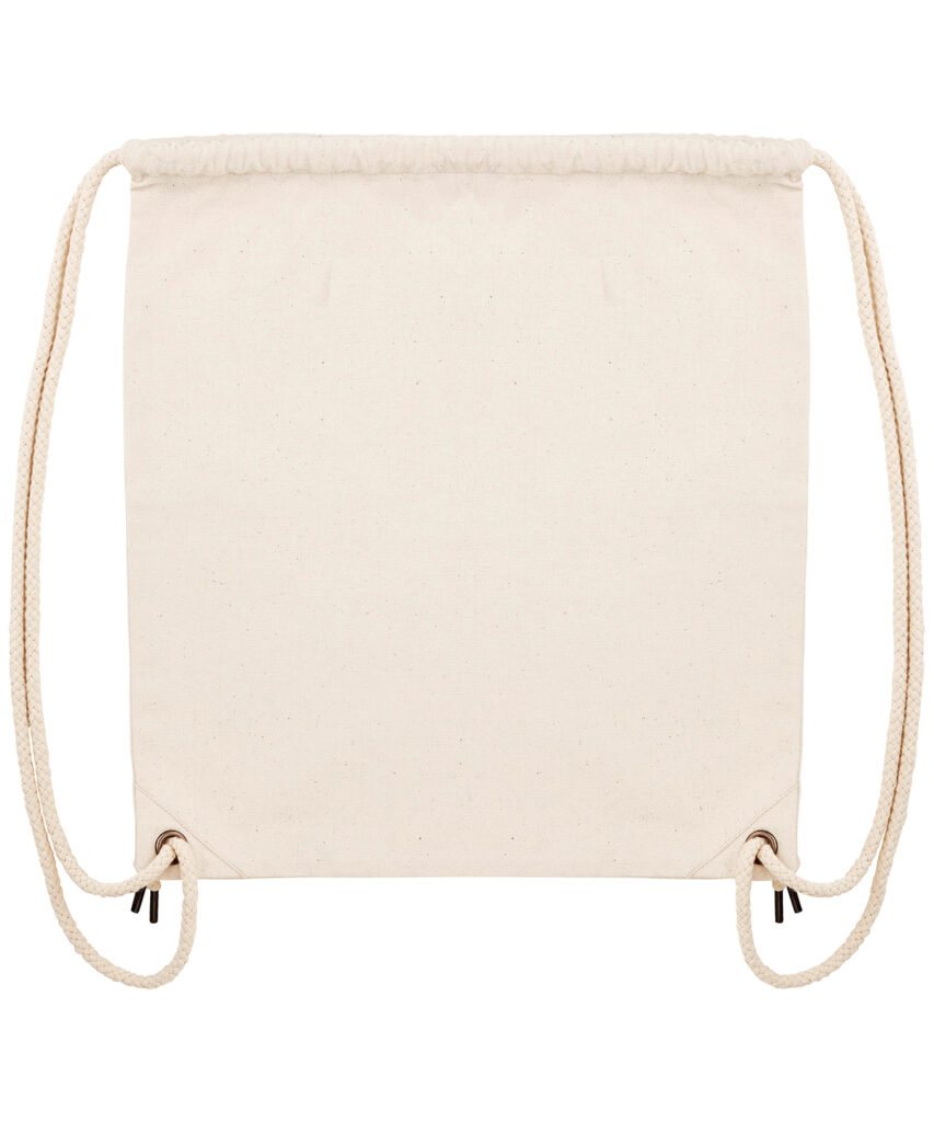 Top edge double folded for strength and clean finish. Reinforcing bar tack at tunnel openings. Heavy drawcord straps with knot at ends. Gun metal eyelets and drawcord tipping. Reinforcing triangles at bottom corners. Unisex. 80% recycled cotton, 20% recycled polyester. Canvas.
