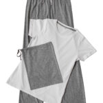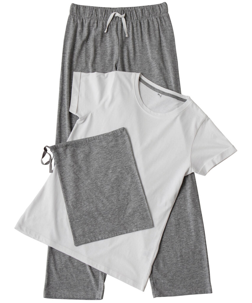 Relax in style with the soft and lightweight pyjama set featuring a white, comfortable loose fit t- shirt with contrast pants and matching drawcord bag. Available in attractive colourways.