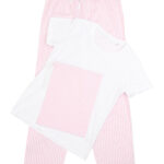 Women’s long pant pyjama set with a white t-shirt with roll up sleeve detail and a looser crew neck. Contrast long pants with an elasticated and draw cord waist. Soft single jersey perfect for decoration. Keep away from fire. SEDEX certified. Oeko-Tex certified. BSCI certified.