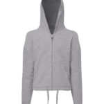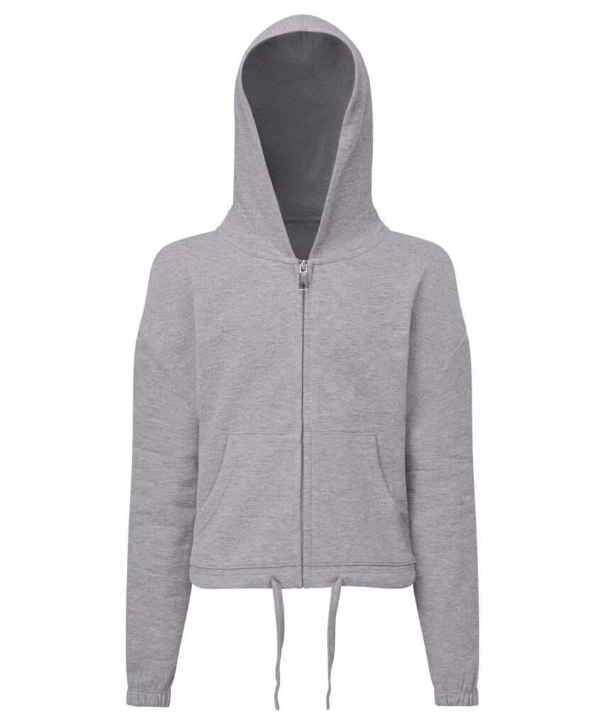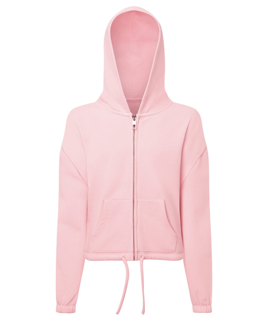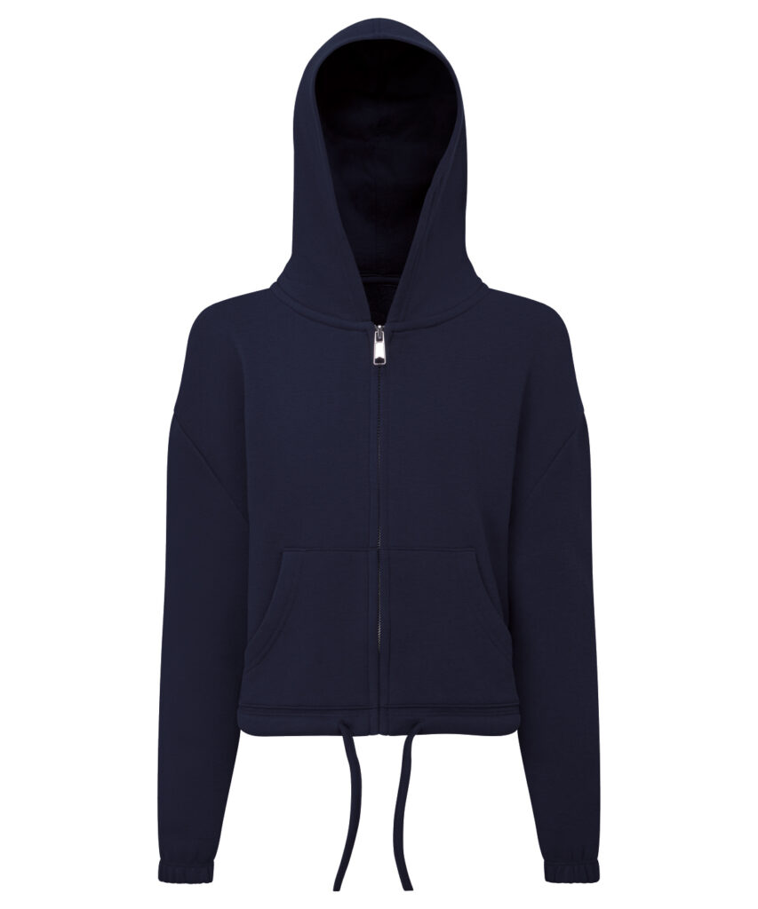 Oversized, cropped hoodie full-zip hoodie. Concealed zip to front in chrome finish. Dropped shoulders. Drawstring tie to waist which is sewn in at the back of the garment. Kangaroo pockets to front. Recycled polyester. We recommend using block out vinyl and inks. Product contains no branded neck or waist label. Removable Kimble or looped garment tags. Inner seam label holds important product information on one label with a second label containing brand information which can be cut-away.