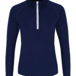 Contrast zip. Long sleeves. Stretch. Twin-needle stitching. Wicking fabric. We recommend using block out vinyl and inks.Product contains no branded neck or waist label. Removable Kimble or looped garment tags. Inner seam label holds important product information on one label with a second label containing brand information which can be cut-away.