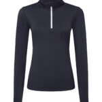zip design. Long sleeves. Stretch. Recycled polyester. Wicking fabric. Brushed inner. The product contains no branded neck or waist label. Removable kimble or looped garment tags. The inner seam label holds important product information on one label with a second label containing brand information which can be cut-away. We recommend using block out vinyl and inks.