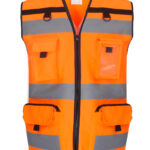 Heavy-duty, hi-vis ripstop tool vest with multiple pockets for convenience at work. Two double pockets accessed from the top with zip and hook and loop closure. Double D rings. Chest pockets with flap closure and pulls. ID card display. Adjustable hem with two press buttons. Also available with open mesh on the bottom to provide better breathability and comfort in hot working environments and seasons. Conforms to EN ISO20471:2013 Class 2. Large decoration area on the back. Certified Sedex and OEKO-TEX.