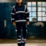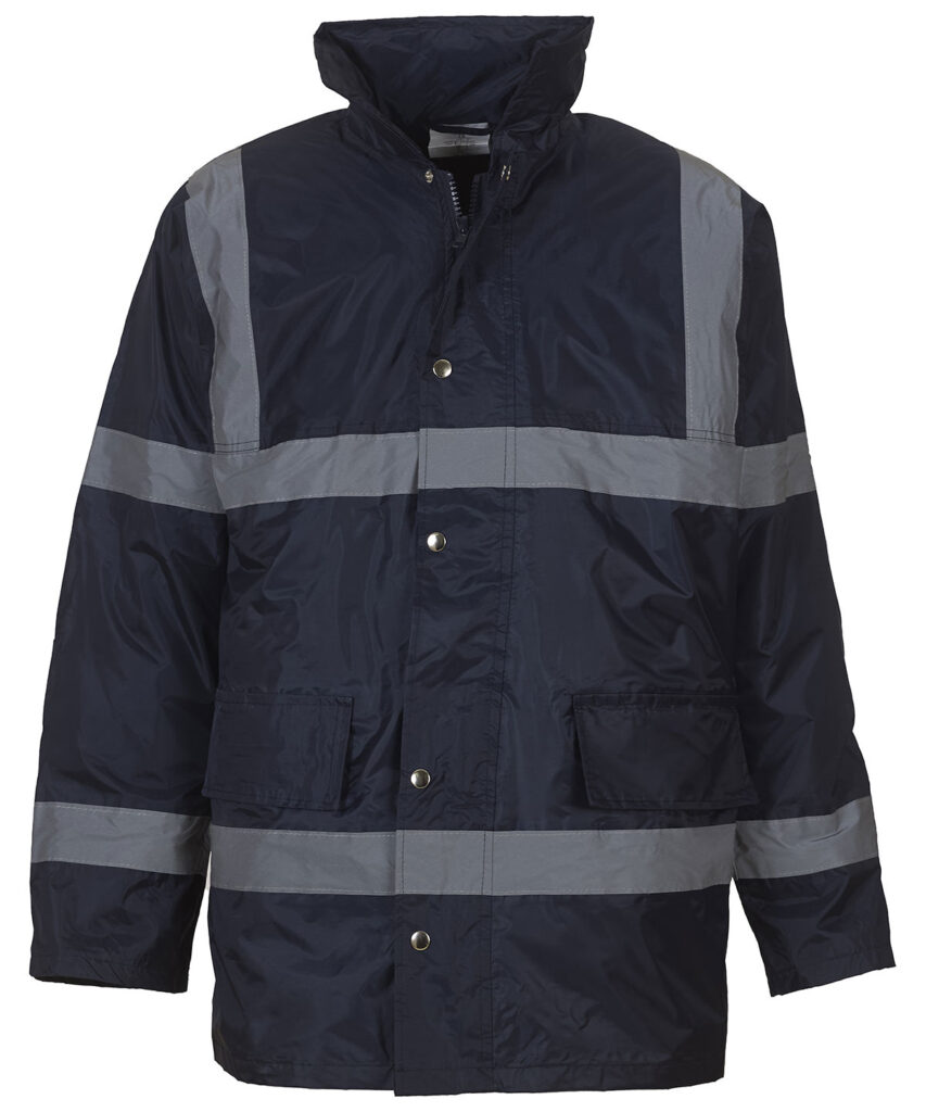 Fully waterproof & windproof security jacket with the enhanced visibility for safety. PU coated Nylon outer fabric with 190g quilted padding and Nylon lining. Heavy duty zip with studded storm flap. 2 outer pockets with over flaps. Elasticated Knitted storm cuffs in the sleeve ends. Step collar with a concealed integral hood. Inside breast pocket. Throughout stitched and taped seams to ensure waterproof. Matching trousers available, code HVS461.